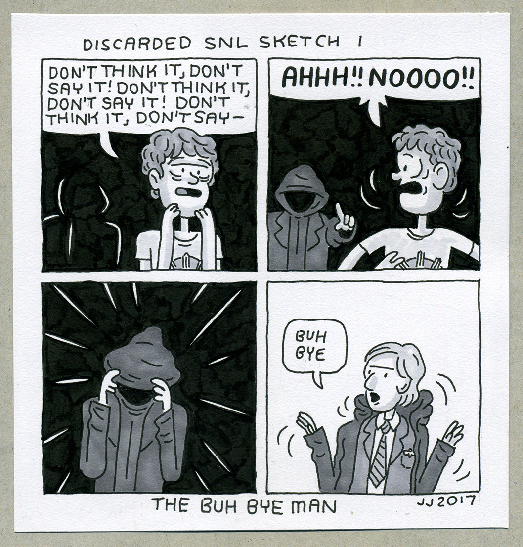 Original ink drawing based on the 2017 Stacy Title movie The Bye Bye Man and uhh, also SNL. Paper size is approx. 5" x 5.25".