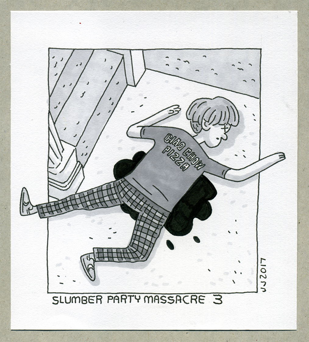 Original ink drawing based on the 1990 Sally Mattison movie Slumber Party Massacre 3. Paper size is approx. 4 5/8" x 5 1/8".