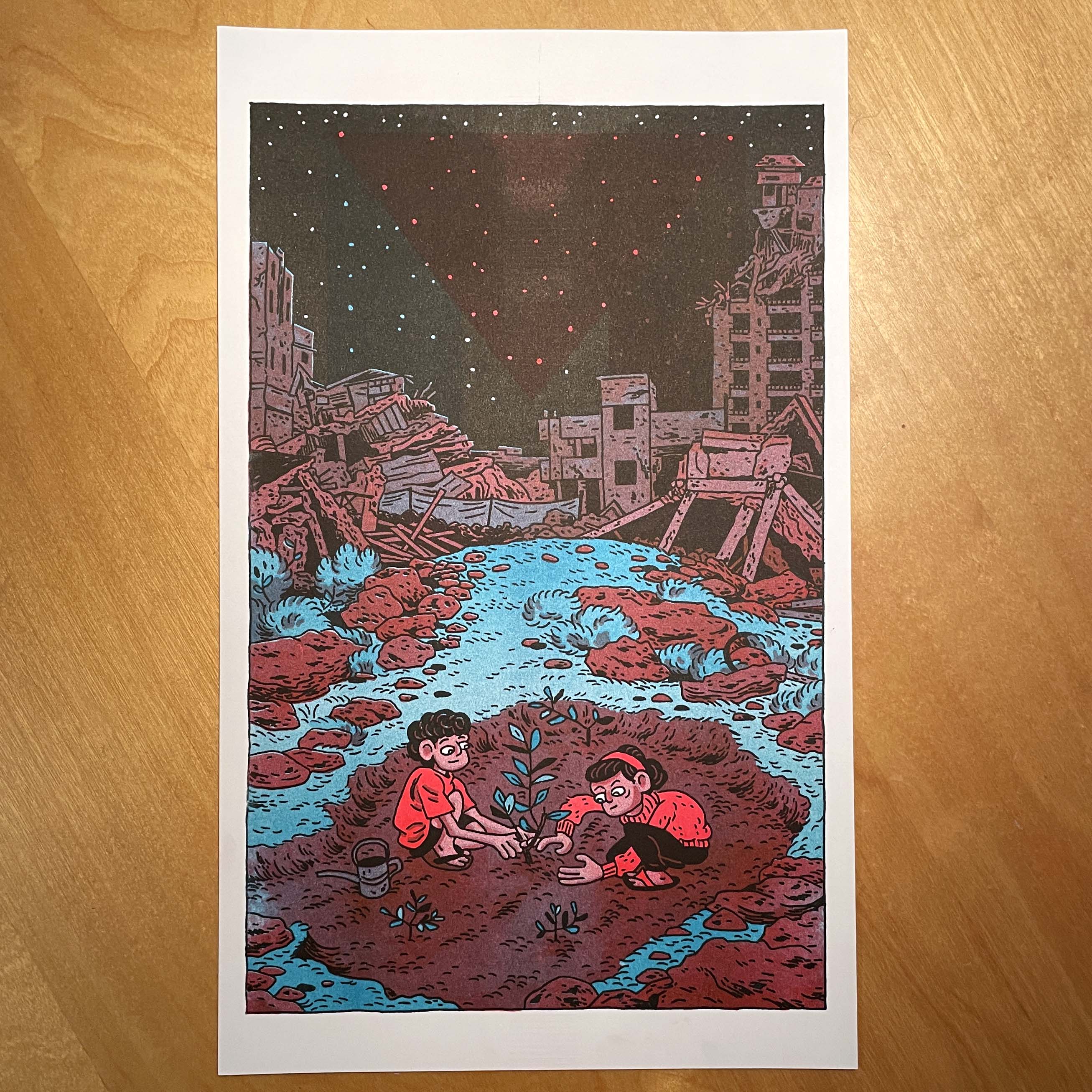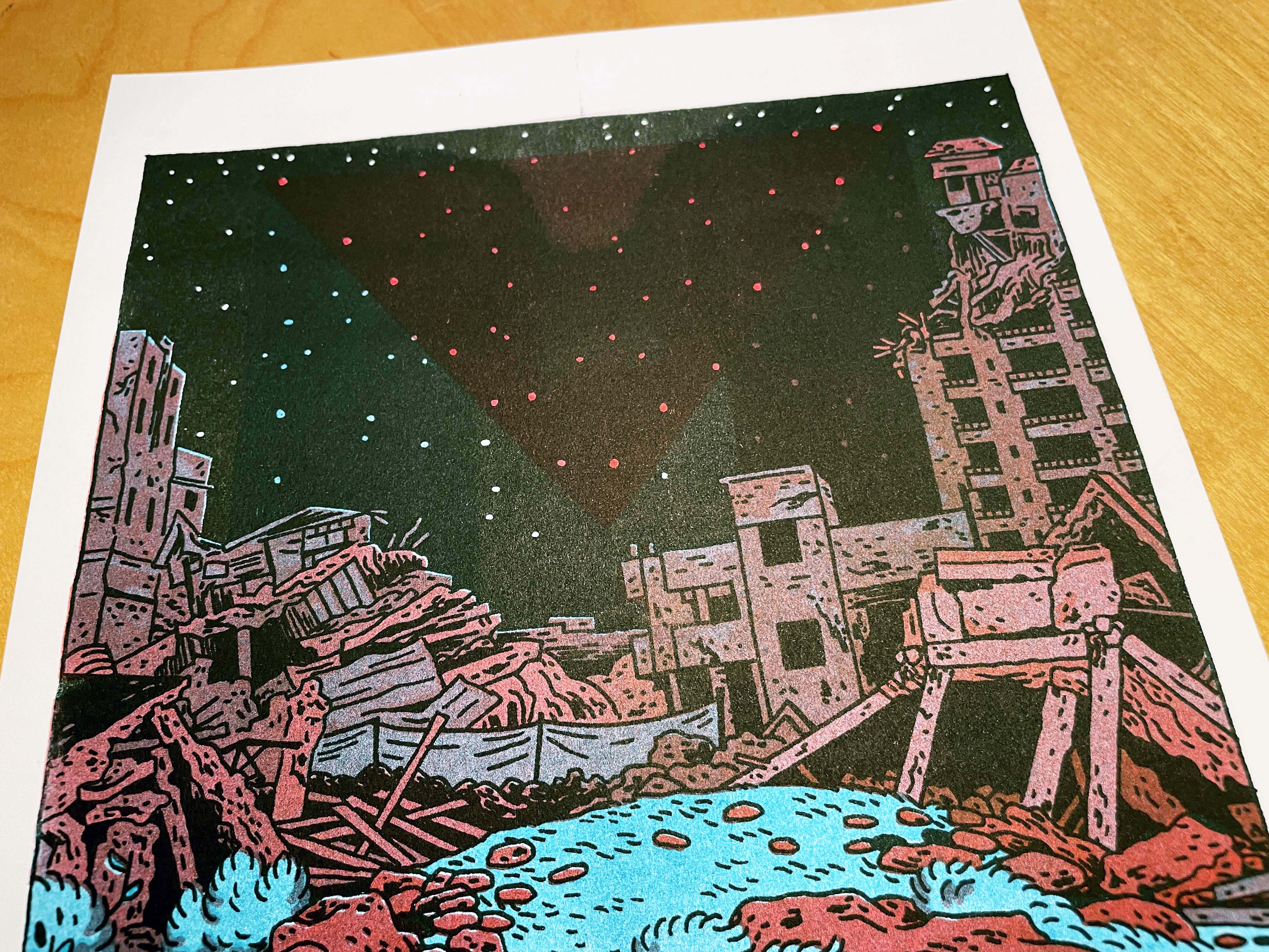 8.5" x 14" Riso print in black, crimson, and teal. Ships flat.